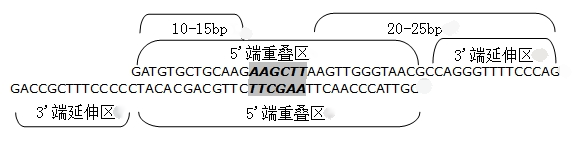 1、引物包含5'端重叠区和3'端延伸区。5'端重叠区长度大约25-30bp,3'端延伸区长度大约是10-15bp。