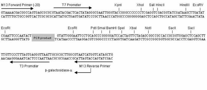 pBLUE-T载体图谱、启动子和多克隆位点序列: